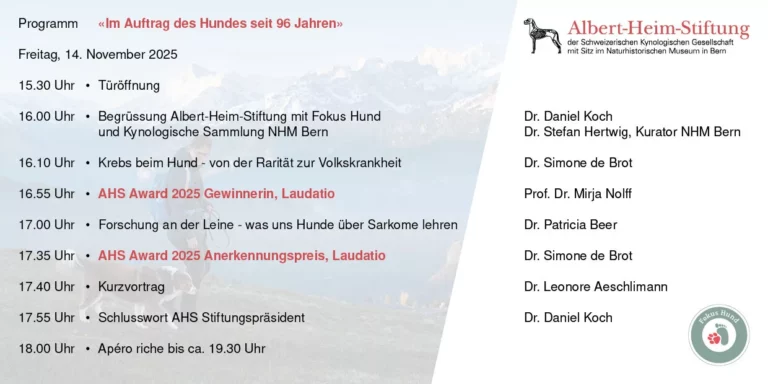 Die Albert-Heim-Stiftung lädt unter dem Motto «Im Auftrag des Hundes seit 96 Jahren», zusammen mit dem Förderverein «Fokus Hund» und dem Naturhistorischen Museum Bern, am 14. November 2025 zu einem öffentlichen Fortbildungsnachmittag ein. Im Zentrum steht in diesem Jahr die Krebsforschung. Dr. Simone de Brot wird darüber referieren, weswegen Hunde so oft Tumoren haben. Dr. Patricia Beer und Dr. Leonore Aeschlimann dringen dann tief in die Welt der Sarkome und Karzinome ein und präsentieren die Erstaunliches, unter anderem zur chirurgischen Behandlung und zum Einsatz von KI. Diese beiden Forschenden sind gleichzeitig die 2025-Preisträgerinnen des AHS-Awards für innovative und qualitativ überragende Studien von jungen Forschenden, was als Höhepunkt des Stiftungsjahres am 14. November gebührend gewürdigt wird.